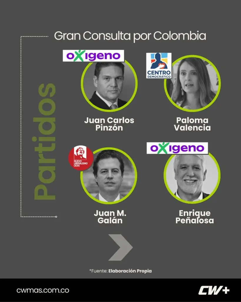 Por el momento son ocho candidatos que manifestaron su interés de ir a la Gran Consulta: Vicky Dávila (movimiento Valientes), Aníbal Gaviria (movimiento La Fuerza de las Regiones), Juan Carlos Pinzón (partido Oxígeno), David Luna (movimiento Firme Luna Presidente), Mauricio Cárdenas (movimiento Avanza Colombia), Juan Daniel Oviedo (movimiento Con Toda Por Colombia), Paloma Valencia (partido Centro Democrático), Enrique Peñalosa (partido Oxígeno) y Juan Manuel Galán (partido Nuevo Liberalismo).