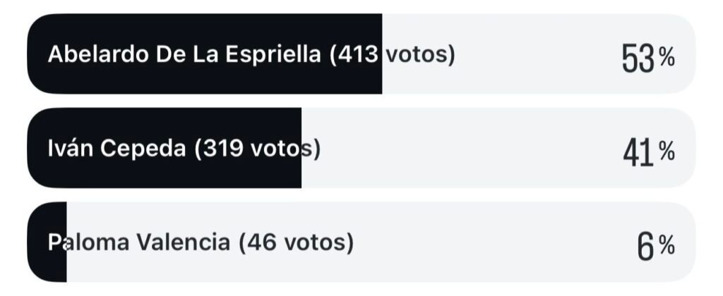 En Instagram, los seguidores de CW+ también participaron en el sondeo digital. Abelardo De La Espriella recibió 413 votos, equivalente al 53% del total; Iván Cepeda logró 319 votos (41%), y Paloma Valencia se quedó con 46 votos (6%). Los resultados muestran un ligero liderazgo de De La Espriella en esta red, evidenciando la diferencia en preferencias según la audiencia de cada plataforma.