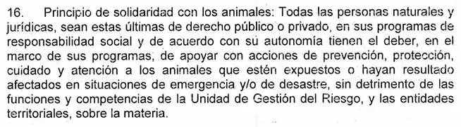 Esta ley, aprobada en julio del año pasado, da tres meses para actualizar la Estrategia Nacional para la Respuesta a Emergencias, incluyendo oficialmente a los animales como sujetos de protección. Además, da plazo de seis meses para coordinar la creación de protocolos sectoriales específicos. De manera local y regional, ordena un año para que las entidades territoriales (Alcaldías y Gobernaciones) ajusten sus propias estrategias y planes de gestión del riesgo.