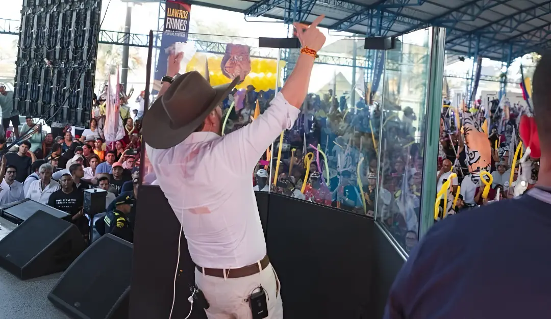 Para proteger al candidato, la campaña implementó un atril blindado en el que De la Espriella se presentó este miércoles en Villavicencio. Vestido con camisa blanca y sombrero, se dirigió al público detrás de tres gruesos paneles de vidrio, acompañado por miembros de su esquema de seguridad. La intención, al parecer, es mantener el contacto con las comunidades y continuar con sus recorridos políticos, a pesar de las advertencias de las autoridades sobre el riesgo de atentados.