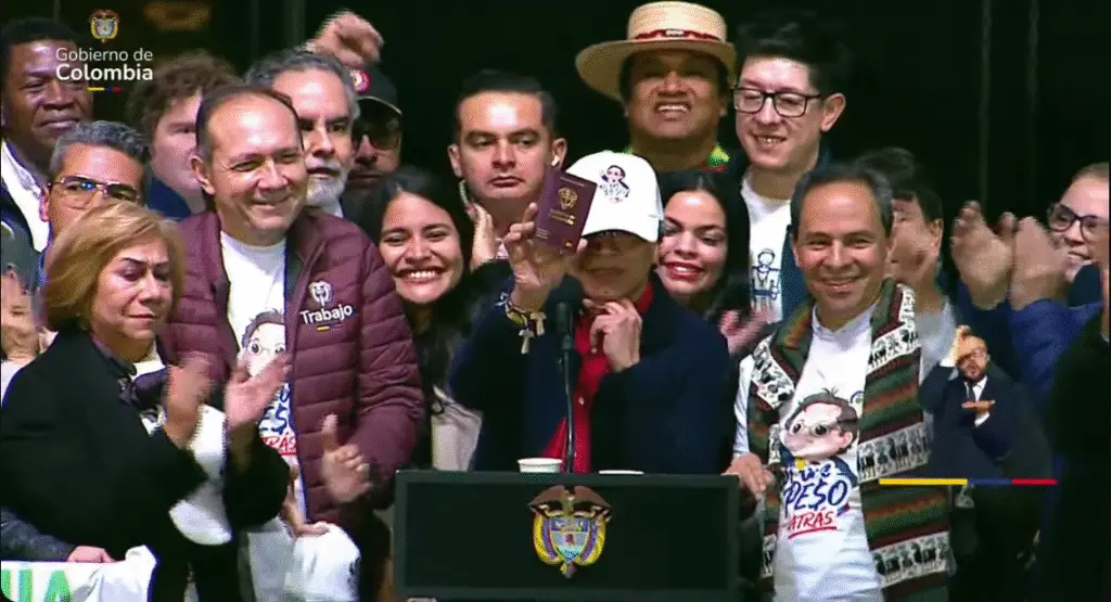 Este jueves 19 de febrero, el presidente Gustavo Petro presentó en vivo el nuevo diseño del pasaporte colombiano. Lo hizo desde una tarima en la Plaza de Bolívar, al frente de manifestantes, quienes se movilizaron más temprano en contra de la decisión del Consejo de Estado que suspendió provisionalmente el decreto del salario mínimo vital. En medio de la presentación, arremetió en contra de Thomas Greg & Sons, la empresa que tenía el negocio de expedición del documento antes de que Petro se lo quitara.
