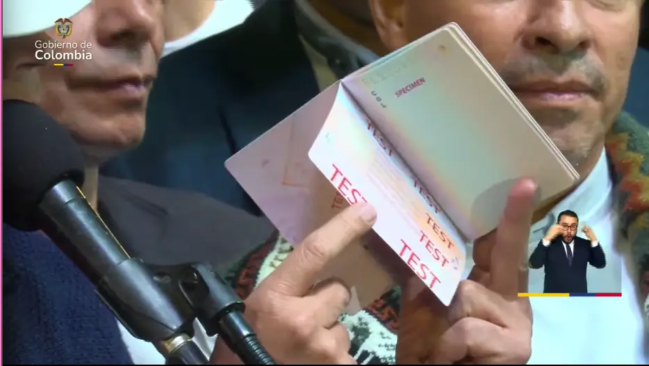 El presidente Petro presentó ante el público el nuevo pasaporte. Como se ve en algunas de sus páginas, dice ‘test’. Esto significa que es solo un modelo de muestra. Sin embargo, aseguró que ya están disponibles y que la Cancillería tiene una trazabilidad de 50 mil pasaportes que serán expedidos hasta abril. Además, señaló que las máquinas para imprimirlos ya están en el país.