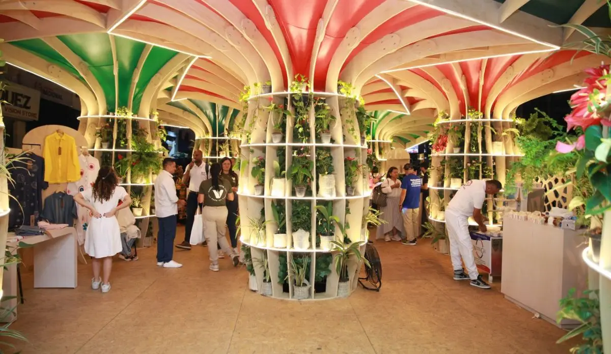 Con una estructura imponente y ecológica, construida en su totalidad con materiales reciclables y vegetación autóctona, el stand presenta elementos en tonos rojos y verdes que evocan los colores de la flora regional. Los materiales incluyen madera reciclada y lonas de fibras naturales como el fique, dispuestas en una composición visualmente atractiva que permite a los visitantes conectar con la cultura y la riqueza natural de la región.