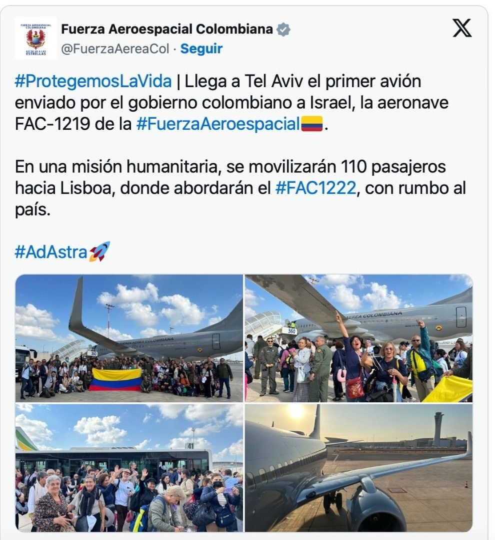Este miércoles, dos aviones C-40 Boeing 737 de la Fuerza Aeroespacial Colombiana partieron del Comando Aéreo de Transporte Militar (CATAM) en Bogotá para retornar a aproximadamente 220 connacionales que se encuentran en Israel. La primera aeronave, FAC-1219, despegará a Tel Aviv, realizando escalas en Punta Cana y Lisboa, en un vuelo de aproximadamente 20 horas. Mientras tanto, el FAC-1222 partirá hacia Lisboa para recibir a los primeros pasajeros evacuados y luego regresar a Colombia.