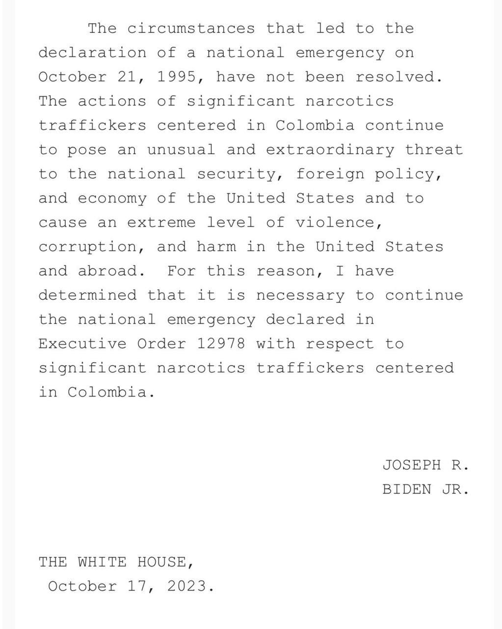 La administración del Presidente de Estados Unidos, Joe Biden, ha presentado una solicitud al Congreso de los Estados Unidos para la renovación de la declaración de emergencia nacional relacionada con Colombia. Esta petición se basa en la percepción de que el narcotráfico en Colombia sigue representando una amenaza continua para la seguridad nacional, la política exterior y la economía de Estados Unidos, generando niveles extremos de violencia, corrupción y daño tanto en Colombia como en el extranjero.