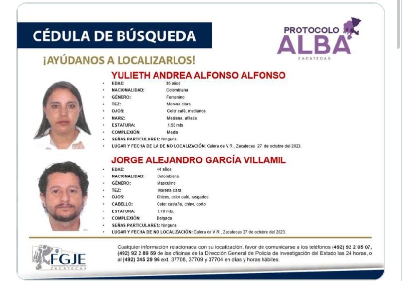 Una familia Colombiana conformada por 3 menores de edad y 2 adultos se encuentra desaparecida en el Estado Mexicano de Zacatecas.