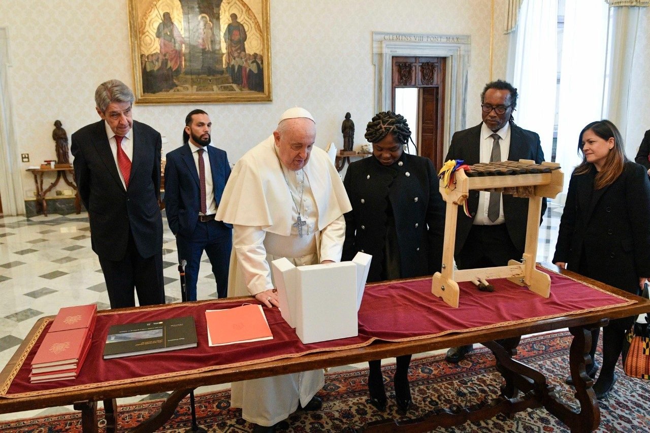 Finalmente, la vicepresidenta le obsequió al papa un instrumento musical llamado ‘El piano de la selva’ y el regalo a la mandataria, una escultura que realizan en la casa pontífice.