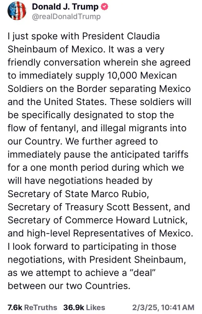 “Acabo de hablar con la presidenta de México, Claudia Sheinbaum. Fue una conversación muy amistosa en la que ella aceptó enviar de inmediato 10.000 soldados mexicanos a la frontera que separa a México de los Estados Unidos. Estos soldados estarán específicamente designados para detener el flujo de fentanilo y de inmigrantes ilegales a nuestro país.”