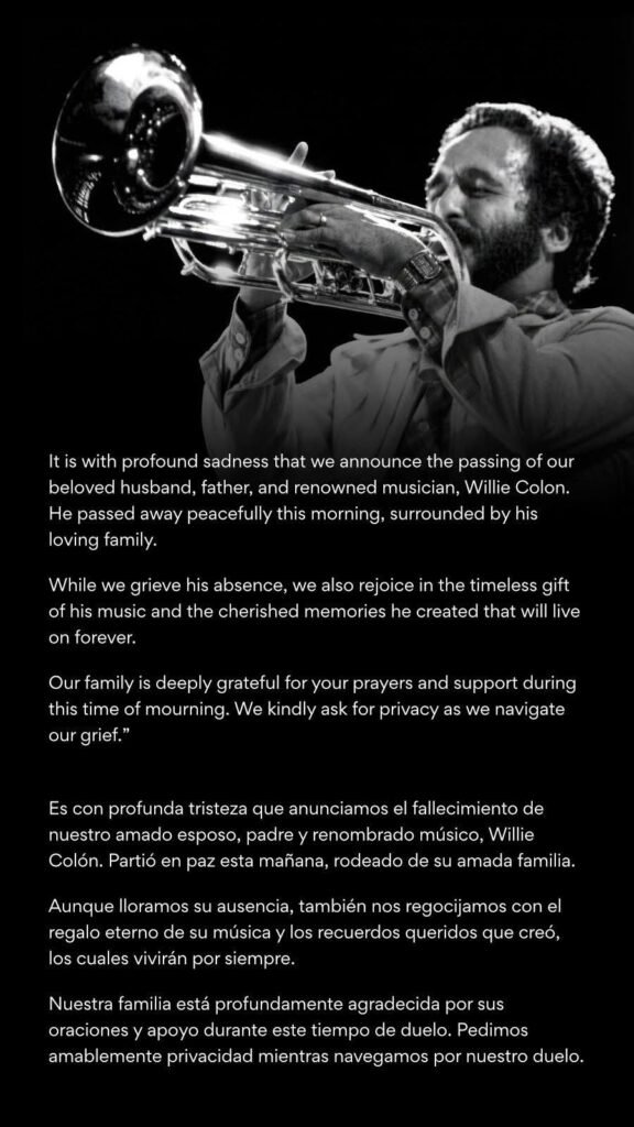 El mundo de la salsa y la música latina en general recordará siempre a Willie Colón, por su talento, su visión artística y su influencia en la cultura musical de generaciones enteras.