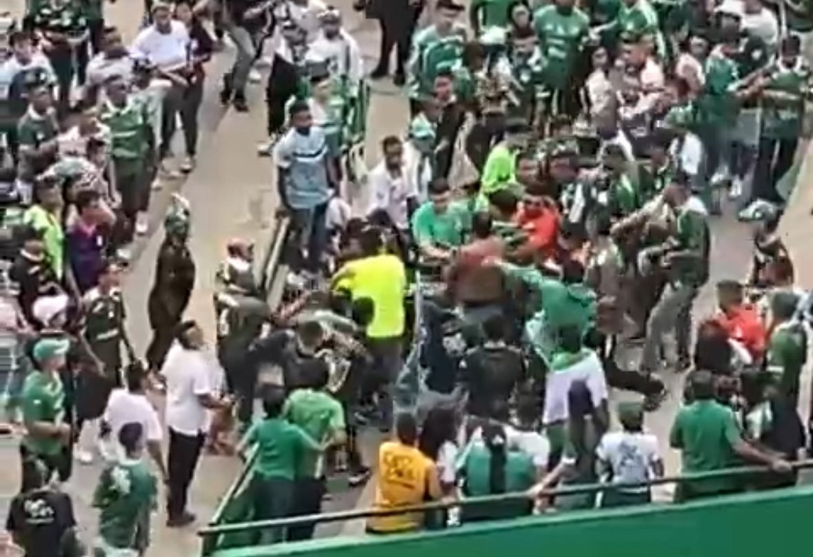 A minutos de iniciar el partido se presentó una pelea, al parecer se trató de un hincha infiltrado en la zona del equipo verde.