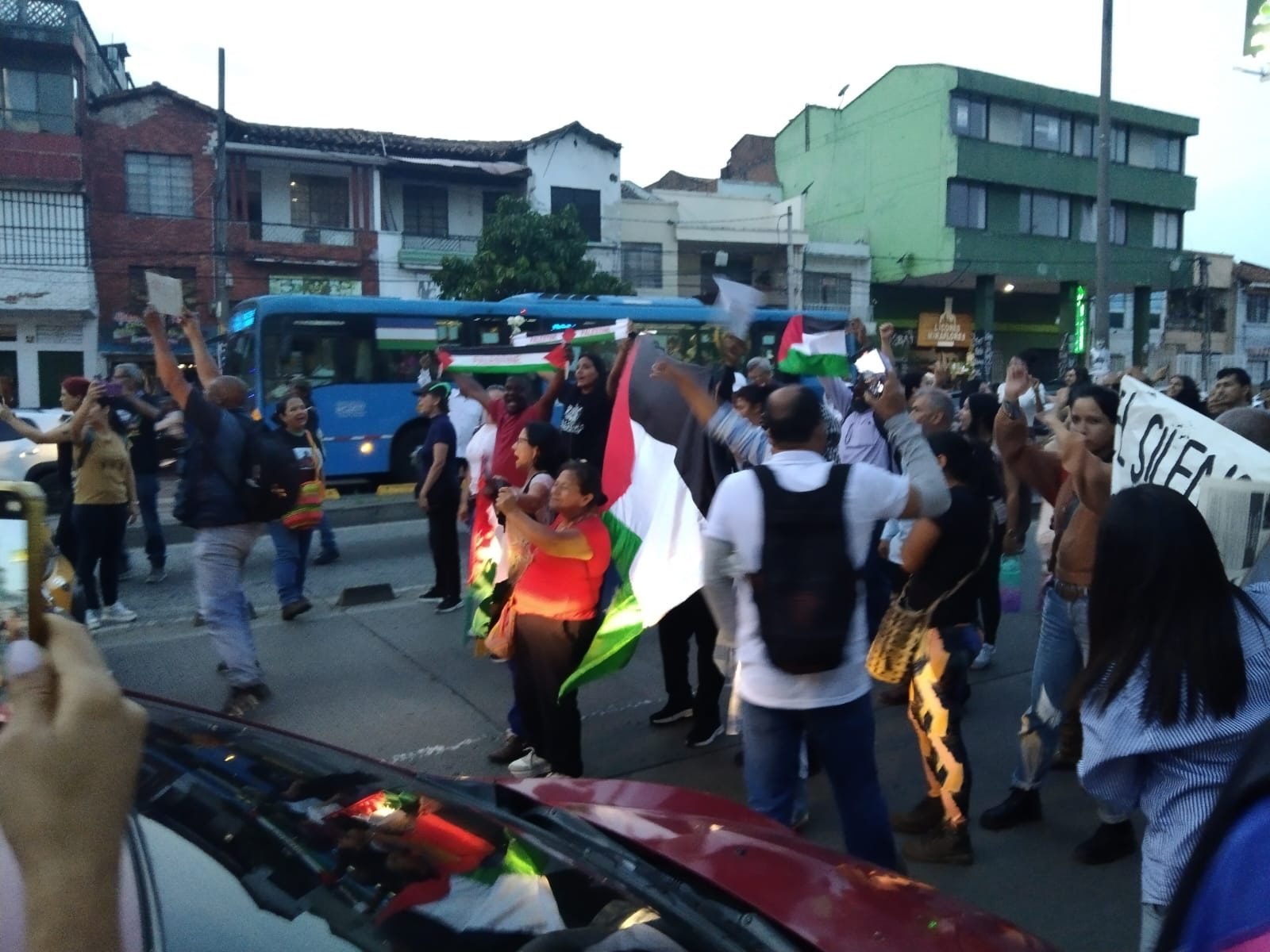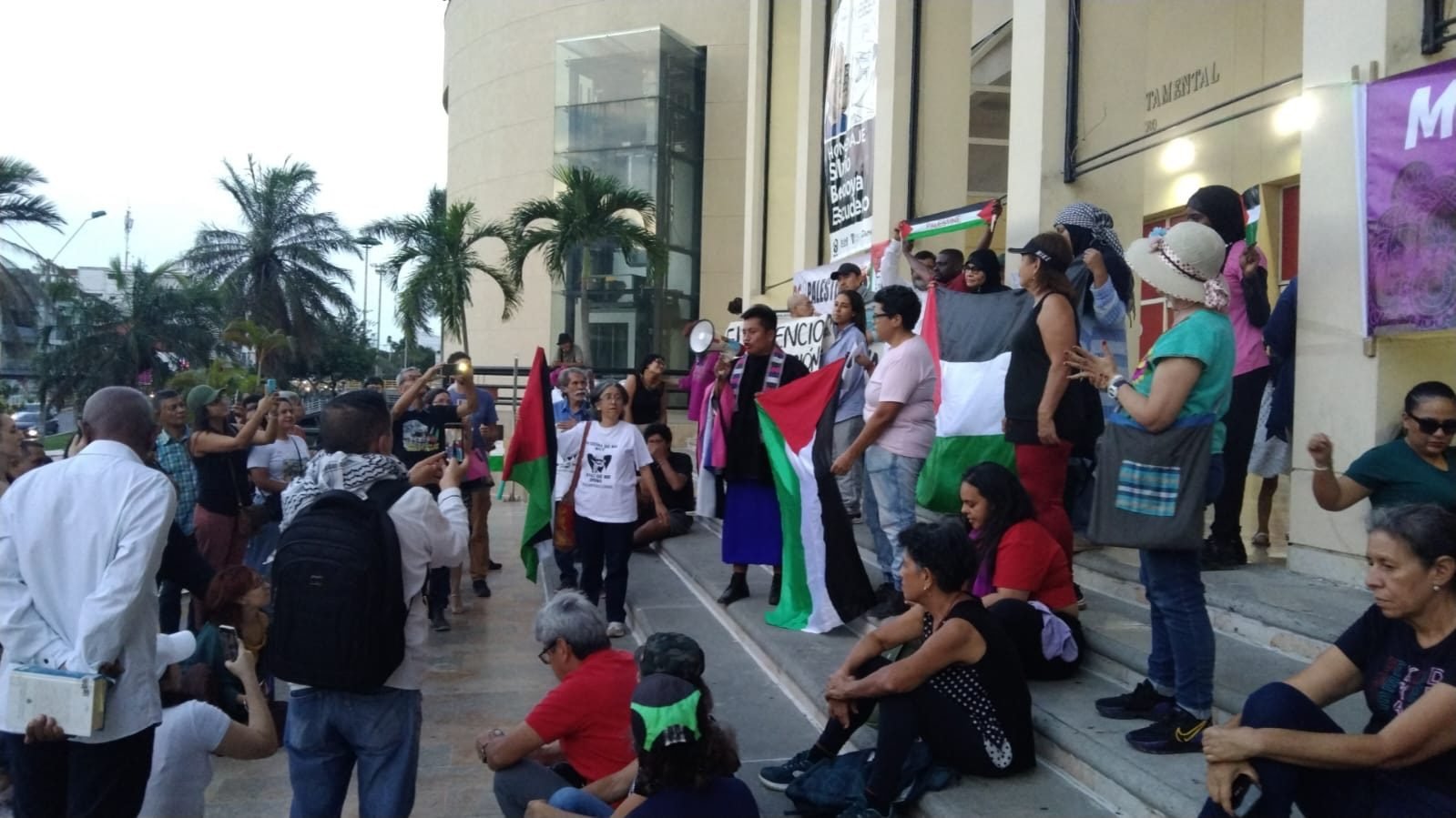 A esta hora se realiza un acto público de apoyo a Palestina a las afueras de la Biblioteca Departamental en Cali.