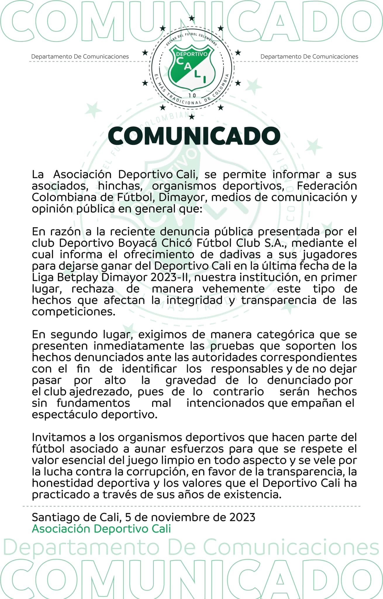 Luego de la fuerte denuncia del equipo Boyacá Chicó sobre soborno a sus jugadores para perder el próximo martes, el equipo caleño se pronunció con este comunicado.