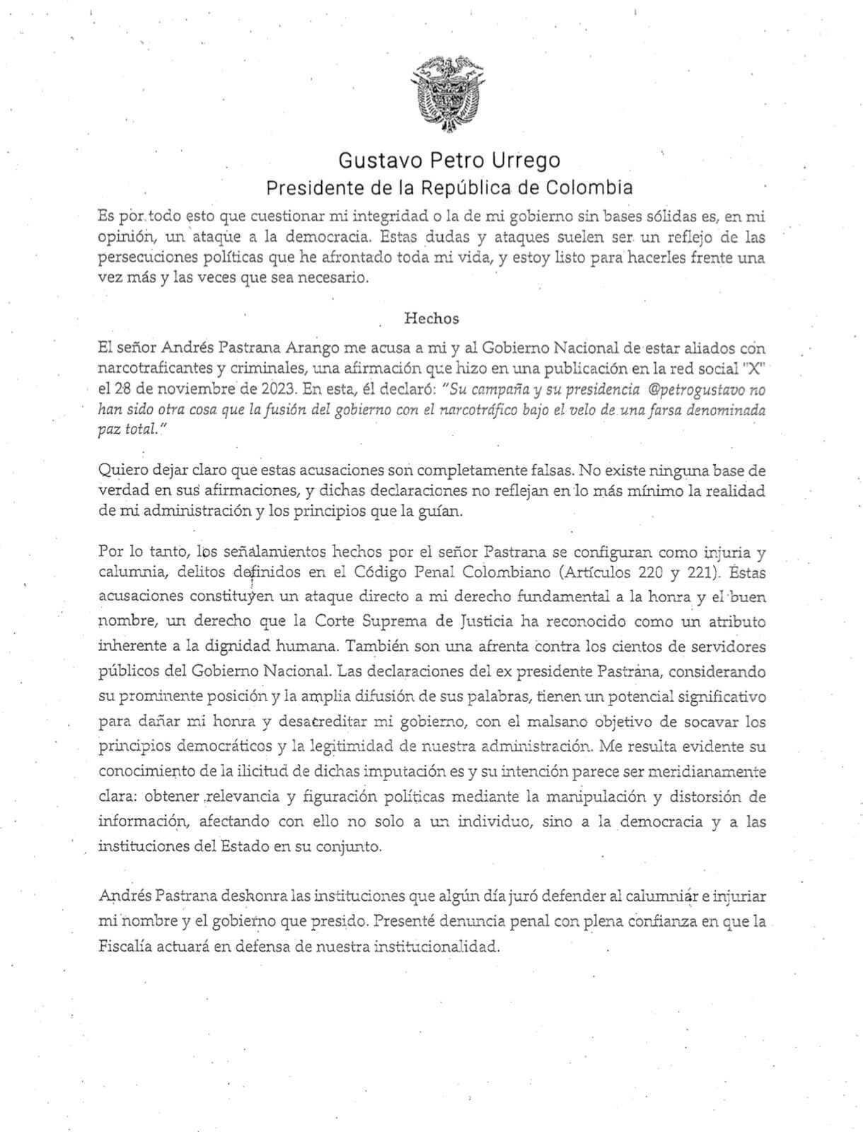 El presidente Gustavo Petro denunció al expresidente Andrés Pastrana por los delitos de injuria y calumnia.