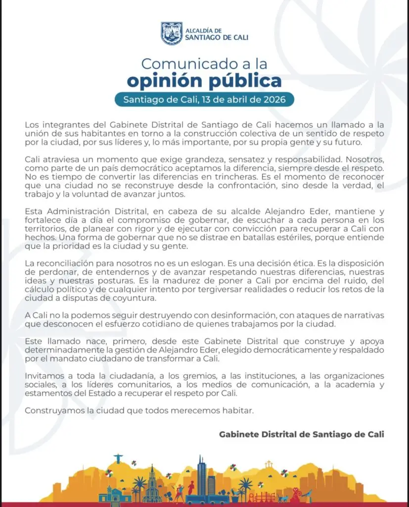 El Gabinete Distrital de Cali usó el membrete institucional, el escudo oficial y los recursos del Estado para publicar, esencialmente, un ruego. Un ruego de que les crean, de que los respeten, de que los dejen trabajar.