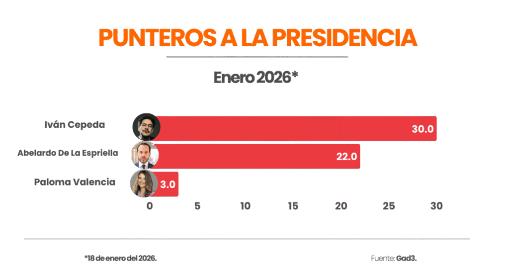 Finalmente, el pasado 18 de enero, la encuesta Gad3 pagada por RCN, volvió a poner a Cepeda como el primero, con un 30% de intención de voto. En el segundo lugar quedó Abelardo De La Espriella, con un 22%. Y de tercera, subió Valencia, con un 3%. Valencia además es la favorita de la consulta de la centroderecha, seguida por Vicky Dávila y Juan Manuel Galán (8%).