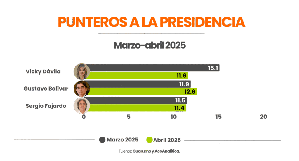 En abril, otra encuesta de Guarumo y AcoAnalítica reportó que esta vez Gustavo Bolívar estaba por encima de Dávila, a diferencia de marzo. Bolívar punteó con un 12,6% de apoyo, Dávila con un 11,6% y Fajardo, con el 11,4%. Días después, el 30 de abril, Bolívar renunció a la dirección de Prosperidad Social para continuar con su campaña por la Casa de Nariño. Ahí, Iván Cepeda solo marcaba un 3,5% de intención de voto.