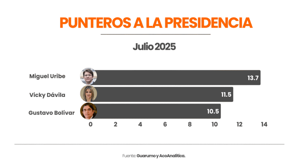 En julio, Guarumo y AcoAnalítica publicaron una nueva encuesta, aplicada a 2.122 personas sobre percepción e intención de voto. Esta vez, el senador y precandidato del Centro Democrático, Miguel Uribe Turbay, encabezó con un 13,7%. Uribe Turbay estaba en cuidados intensivos luego de sufrir un atentado en pleno acto de campaña en un parque de Modelia, en la localidad de Fontibón.