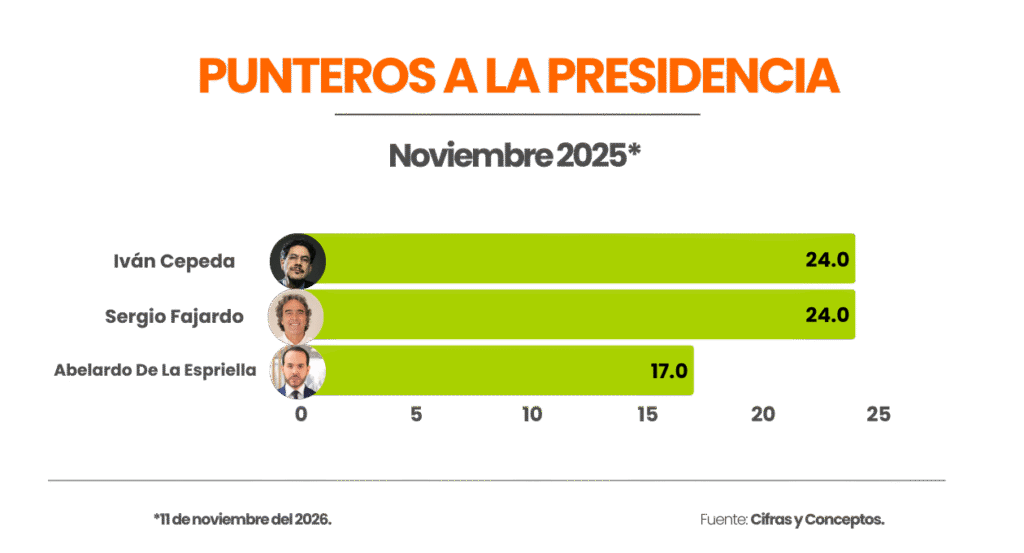 En noviembre, Cifras y Conceptos publicó la primera encuesta después de cumplirse los tiempos establecidos por la ley. Esa fue clave porque mostró la subida de Iván Cepeda (24%) y la llegada de Abelardo De La Espriella (17%) a las encuestas y la contienda. Ambos oficializaron sus candidaturas el 22 de agosto y 16 de julio, respectivamente. Cabe aclarar que Cepeda y Fajardo estaban empatados, con un 24% de intención de voto.