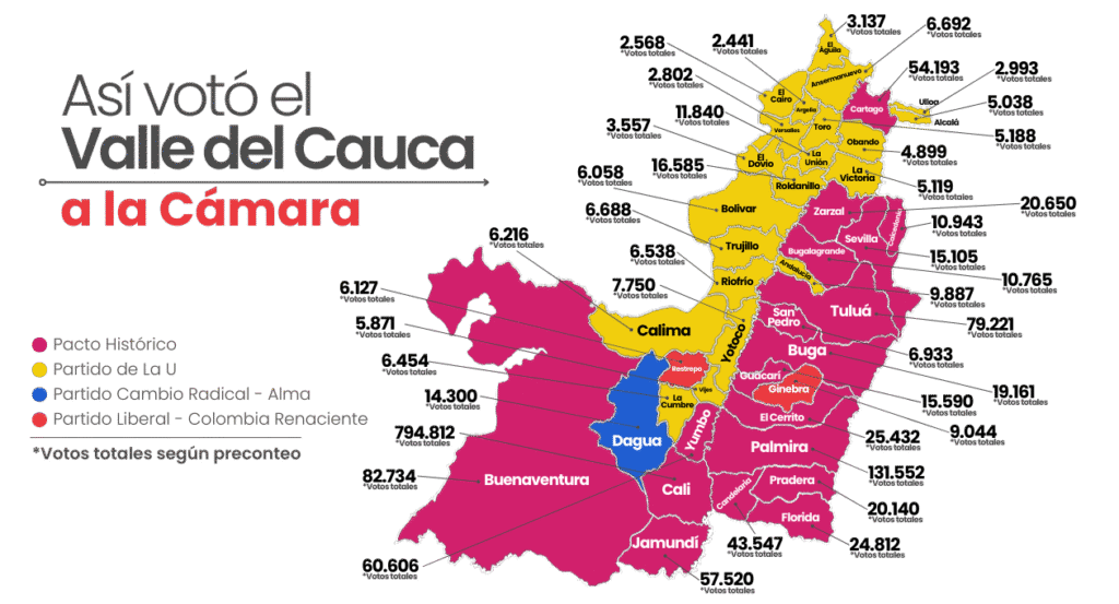 El Valle del Cauca sigue siendo el bastión electoral del petrismo. De los 1.7 millones de vallecaucanos que votaron en la jornada electoral del pasado 8 de marzo, 617 mil votaron por el Pacto Histórico al Senado y otros 589 mil a la Cámara, 200 mil más que en 2022. Pero en medio de la avanzada, el Centro Democrático se fortaleció y el Partido de La U demostró que sigue teniendo capacidad para seducir a sus votantes.
