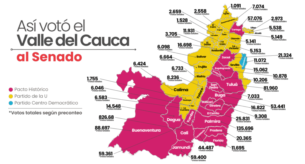 El mismo patrón de la Cámara se repite en el Senado. Las tres fuerzas más poderosas fueron el petrismo, La U y el uribismo. Por su parte, el Pacto sacó 617 mil votos y ganó en 20 municipios. Además dobló los 325 mil votos logrados hace 4 años. La mayoría de estos concentran un alto número de votantes. Por ejemplo, Cali, que puso 330 mil votos a la lista; seguido de Palmira, con 49 mil votos, y Buenaventura, con más de 27 mil.