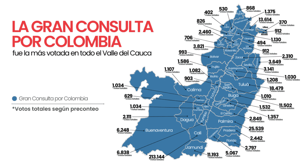 Las consultas presidenciales tuvieron 455 mil votos. La ganadora fue ‘La Gran Consulta Por Colombia’ con 360 mil, el 79% de estos. La senadora Paloma Valencia, candidata del Centro Democrático, fue la vencedora con 202 mil votos y siendo la más votada en los 42 municipios del Valle.