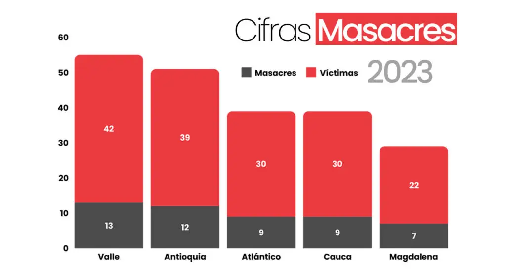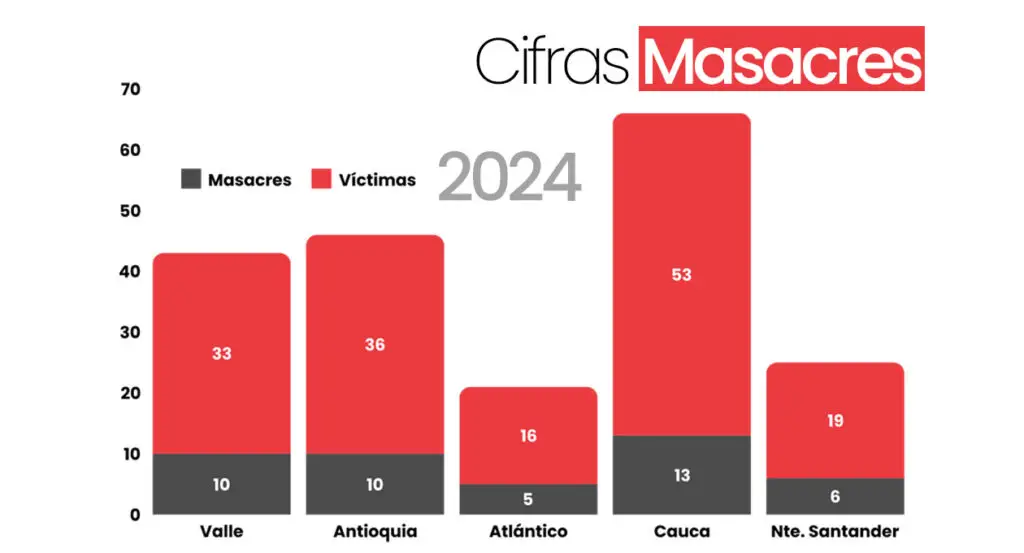 Pese a la disminución, el Valle del Cauca se posicionó como el segundo departamento con más casos de masacres junto a Antioquia y por debajo del Cauca. Un suceso que rompe el patrón que había liderado en los últimos años, como el departamento con mayores masacres en el país.