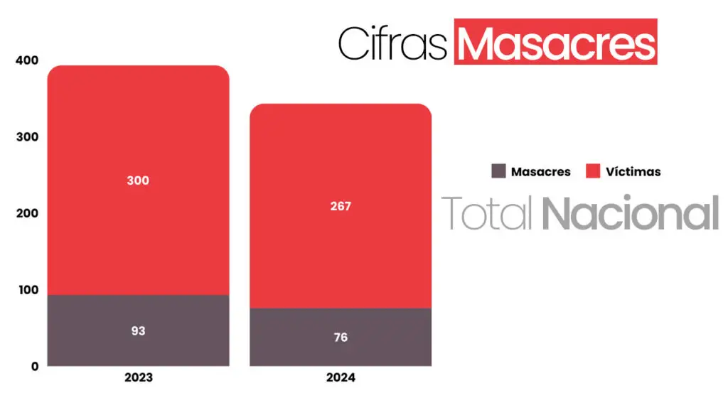 267 personas fueron víctimas de este fenómeno en 2024, 33 menos personas que en 2023, cuando la cifra fue de 300. Esta también es la cifra más baja desde la pandemia, cuando pasaron de 51 masacres en 2019 a 91 en 2020.