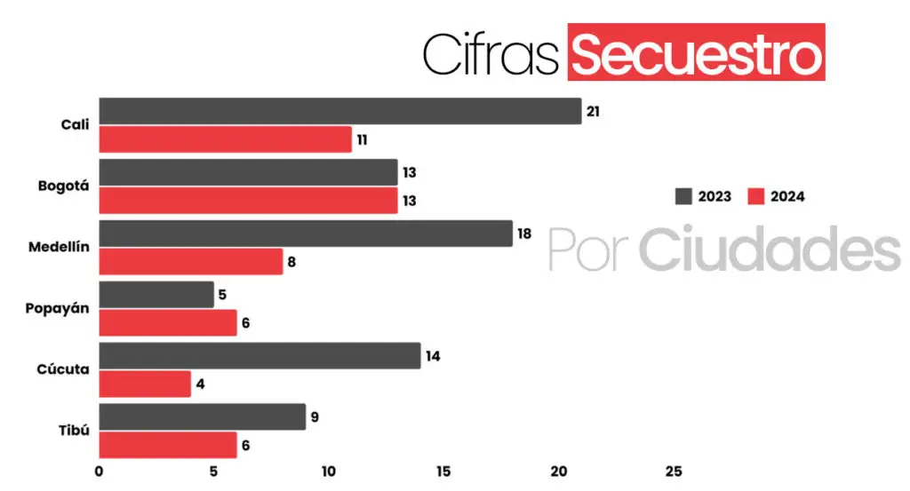 En el último año, el país tuvo una disminución del 17% en secuestros simples y extorsivos. Pasaron de reportar 338 casos en 2023 a 279 a finales de 2024. La reducción se da especialmente en los grandes cascos urbanos como Bogotá, Cali, Medellín y Cúcuta. Aunque hay algunos casos en zonas rurales que también decrecen como Tibú u Ocaña, donde pasaron de 9 a 6 o 4 casos, respectivamente.