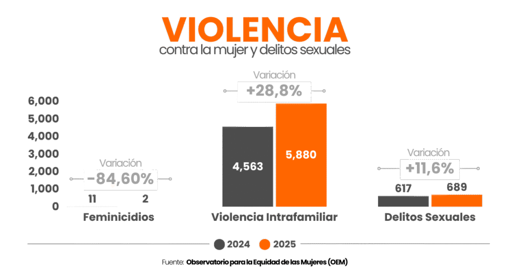 En 2024 y 2025 se registraron 30 casos de homicidios dolosos, frente a los 20 ocurridos en 2023. Por otro lado, el panorama de la violencia intrafamiliar contra mujeres sigue en subida. Para este año, se reportaron 5.880 casos, un alza del 76% frente a los 4.563 que hubo en 2024. Los casos se han mantenido en subida, pues en 2023 hubo 3.338.