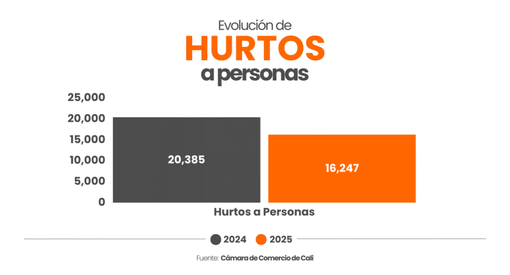 Según cifras de la Policía Nacional, hasta el 30 de noviembre de este año, se registraron 16.247 casos de hurto a personas. Significa una disminución del 20,3% frente a los 20,385 que hubo en el mismo periodo del 2024. Para este año, el 50,8% de los hurtos se cometieron sin emplear armas; el 27,2% con arma de fuego; el 12,5% con arma cortopunzante y el otro 0,6% con armas contundentes.