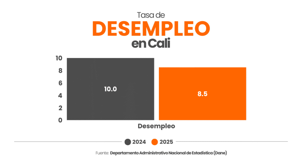 Ese porcentaje del 8,5% se mantuvo por el trimestre entre agosto y noviembre, según el informe ritmo laboral de la Cámara de Comercio de Cali. Es la cifra más baja registrada desde 2007. En comparación con el mismo periodo del 2024, la tasa se redujo un 1,5%. La cifra porcentual equivale a 105 mil personas desocupadas. Esto significa que hubo una reducción de 15,6 mil desempleados (un descenso del 12,9%) frente al año anterior.