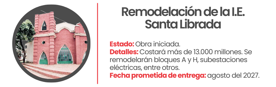 En el plan de desarrollo de Eder, Santa Librada está incluida en el paquete de las sedes educativas públicas que serán restauradas, construidas o adquiridas. Inicialmente, la Alcaldía transfirió 5 mil millones al Fondo de Financiamiento de Infraestructura Educativa (Ffie) del Ministerio de Educación para contratar los estudios y diseños del colegio.