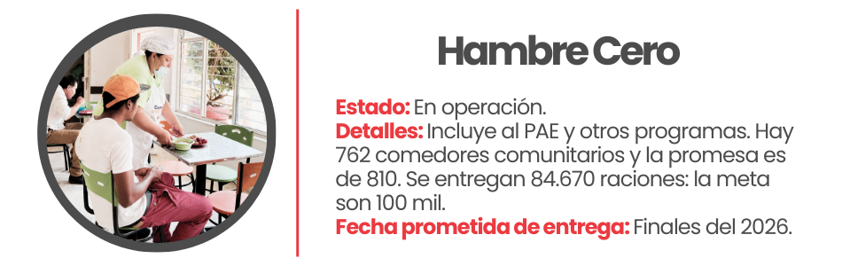 Para 2025, la inversión fue mayor. Contó con un presupuesto de $102.800 millones de pesos, de los que se utilizó el 98% en dos proyectos. El primero tuvo la principal inversión con $102 mil millones para fortalecer el programa de seguridad alimentaria y nutrición y también se alimentaron a un poco más de 62 mil personas diariamente con dos contratos que sumaron $28 mil millones de pesos y se ejecutaron entre agosto, septiembre y noviembre. Esto representó alrededor del 27% del presupuesto.