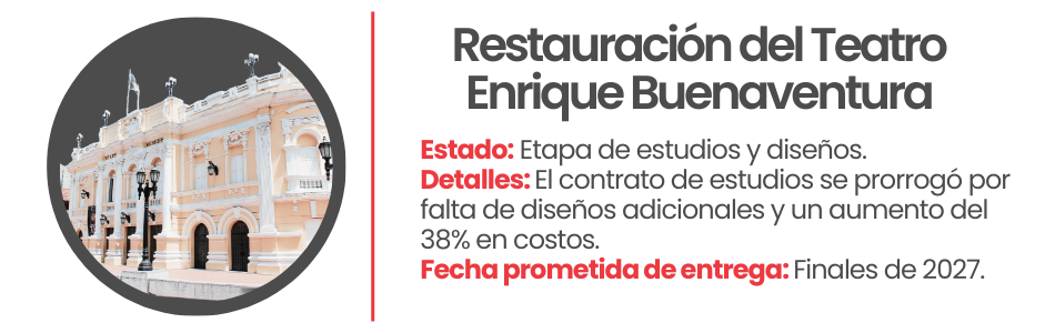 En 2027, el Teatro Municipal Enrique Buenaventura cumple 100 años. Es un Bien de Interés Cultural (BIC) y uno de los espacios clave para el arte y la cultura caleña. El mejoramiento de su infraestructura y reforzamiento están incluidos en el plan de desarrollo de Eder. En diciembre del 2024, la Alcaldía proyectaba entregarlo listo para 2026 en una ejecución de 28 meses. Sin embargo, la contratación de estudios y diseños comenzó seis meses tarde.