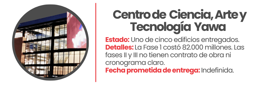 Hasta la fecha, no hay contrato vigente para construir la segunda fase de Yawa. Solo hay una presentación de oferta por 6.036 millones de pesos para administrar el edificio, que estaba a cargo de la Corporación para la Recreación Popular. Fue publicada el 19 de febrero de este año, tiene como fecha de presentación de oferta para el 27 del mismo mes y una duración estipulada hasta el 31 de diciembre.