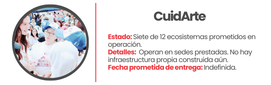 Hasta el día de hoy, la Alcaldía no ha construido espacios propios de los CuidArte. En un derecho de petición respondido a la concejal María del Carmen Londoño, Bienestar Social señala que todos los ecosistemas del cuidado funcionan en inmuebles públicos, como bibliotecas, centros culturales y colegios. Por ejemplo, el CuidArte del centro funciona en la Casa Matria Centro y otras de sus actividades están en el centro cultural del Obrero y en la Institución Educativa República de Argentina.