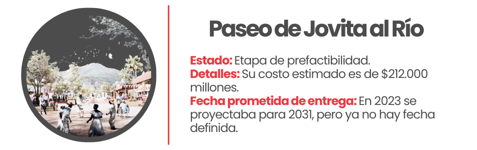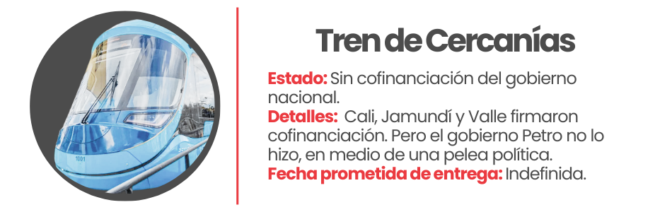 Por otro lado, hay obras que apenas están en etapa de prefactibilidad, como el Paseo de Jovita al Río, y otras que han caído en promesas fallidas de entrega, como la Ruta de la Salsa del barrio Obrero y la restauración del Teatro Municipal Enrique Buenaventura, uno de los BIC más importantes para el arte y la cultura caleña. También está el Tren de Cercanías, que se quedó en vilo tras la negativa del gobierno de Gustavo Petro para su cofinanciación en medio de una pelea política.