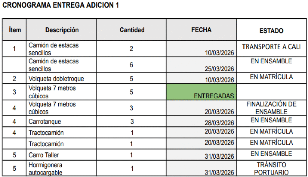 El pasado lunes 2 de marzo, CW+ reveló que la maquinaria amarilla comprada para Cali presentaba retrasos. Para esa fecha ya se había vencido la primera prórroga (28 de febrero), pero en Secop II la Secretaría no había actualizado el estado del contrato. Por eso, se desconocía si el contrato había finalizado o si existía una nueva prórroga.