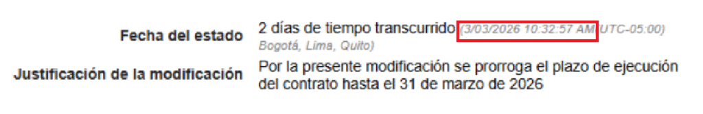 Este mismo caso sucede con el documento oficial donde se establece la prórroga del contrato por un mes más. Aunque al final dice que el documento fue firmado el 27 de febrero, su fecha de creación corresponde al martes 3 de marzo a las 6:38 am y modificado a las 9:55 am.