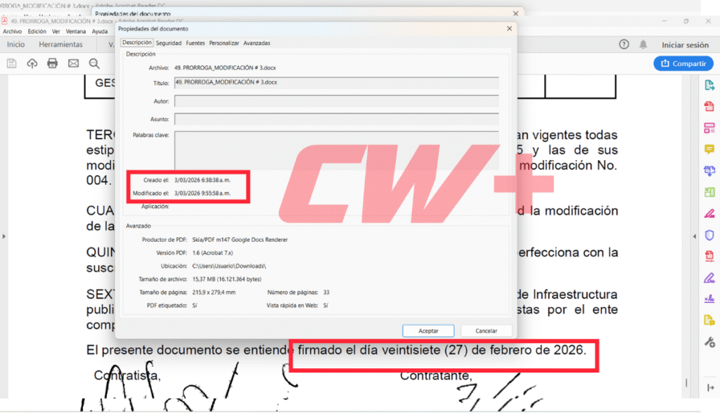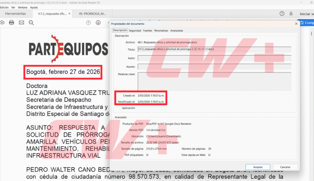 Este medio revisó e inspeccionó cada uno de los tres documentos. Encontró que la solicitud de prórroga del contratista tenía como fecha de remisión el 27 de febrero, un día antes del vencimiento de la primera prórroga. Pero la metadata del documento muestra que se creó el 3 de marzo a la 1:19 de la mañana.