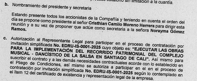 Se trata de un contrato por 13.247.948.740 para “ejecutar las obras para la implementación del recorrido patrimonial del complejo musical – dancístico de la salsa” en Cali. En pocas palabras, para intervenir y remodelar el icónico barrio Obrero. Esdras MD Ingeniería es parte del Consorcio Patrimonio Musical, conformado también por la Fundación para el Desarrollo Social Empresarial y Comunitario de Colombia, que es una entidad sin ánimo de lucro; y Proyectos Construcciones y Montajes SAS. Esdras tiene una participación del 60%; la fundación del 39% y Proyectos del 1%.