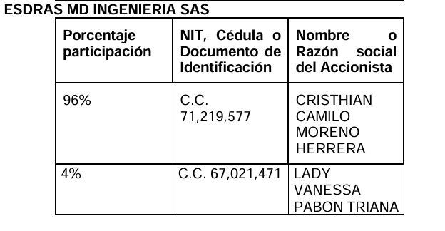 Según la carta de presentación en la oferta, la persona jurídica de Esdras se compone en un 96% por Cristhian Camilo Moreno y en un 4% por Lady Vanessa Pabón, quien aparece como representante legal principal en el Registro Único Empresarial y Social (Rues). Además, Moreno presidió la reunión extraordinaria de socios del 4 de marzo del 2025, en donde se autorizó participar en el proceso de contratación para la obra de remodelación del Obrero. Así lo constata el acta de la reunión cargada en el Secop II.