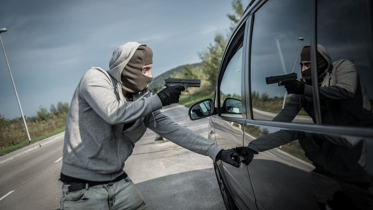 Armado con una pistola, el ladrón apunta al joven mientras sus cómplices ingresan al vehículo.