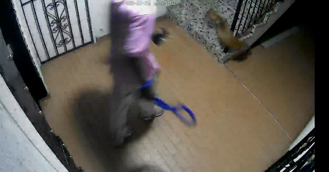 En las imágenes se ve cuando el hombre sale del apartamento y le pega una patada al animal que lo manda contra las escaleras. El agresor sube con el perro y se alcanza a escuchar que lo sigue regañando. Segundos después se escuchan algunos aullidos.