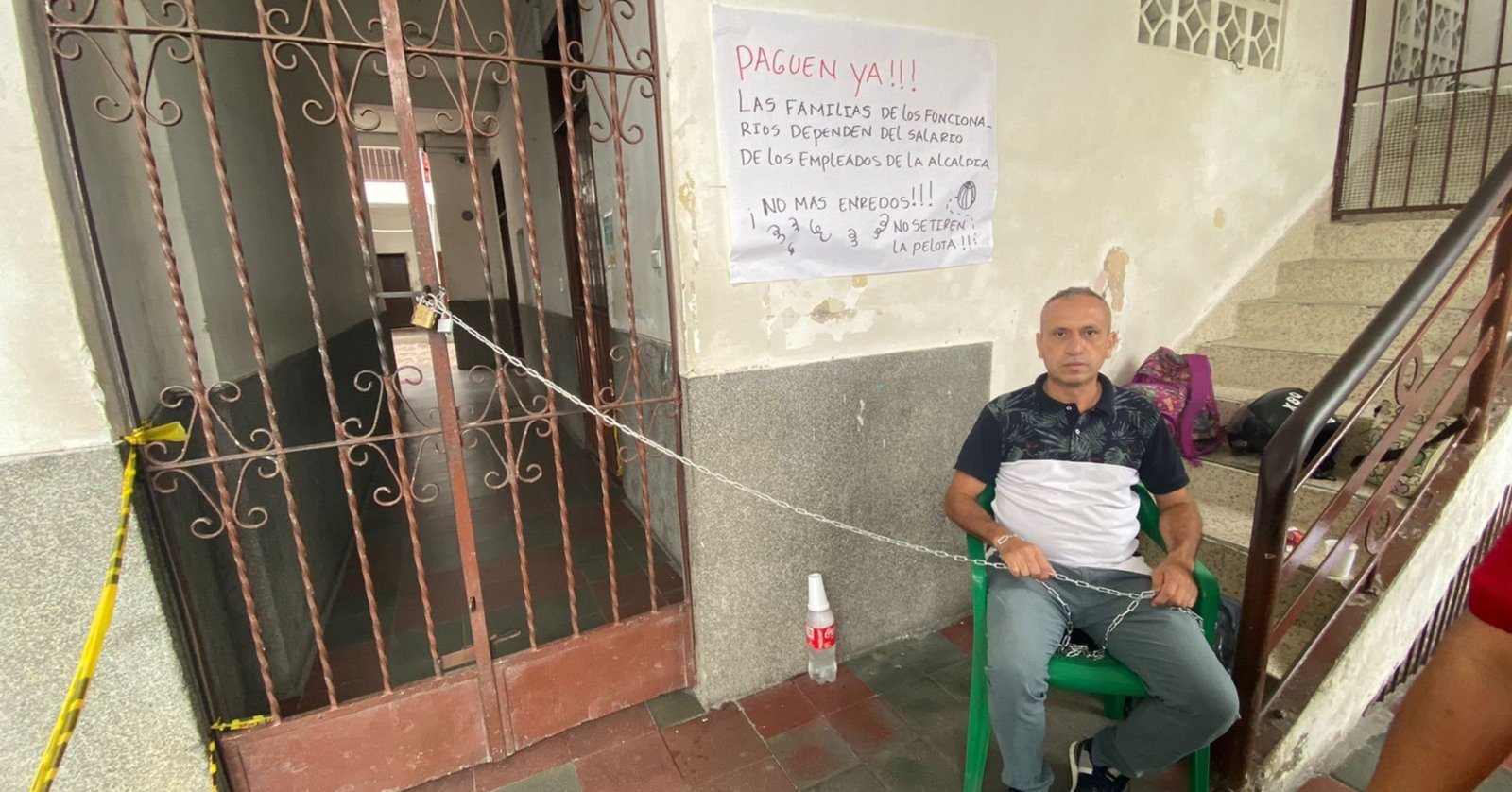 Esto es lo que protesta un empleado de la Alcaldía de Pradera Valle, encadenado a la entrada de la Alcaldía.