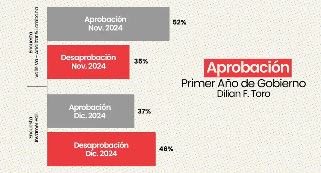 Existe una ambivalencia en la aprobación de la gobernadora Toro. Mientras que la firma de investigación ‘Analizar & Lombana’ en su encuesta “El Valle Va” presentada en noviembre de 2024. Los resultados destacan una aprobación del 52%, con la desaprobación de 35% hacia la gobernante departamental.