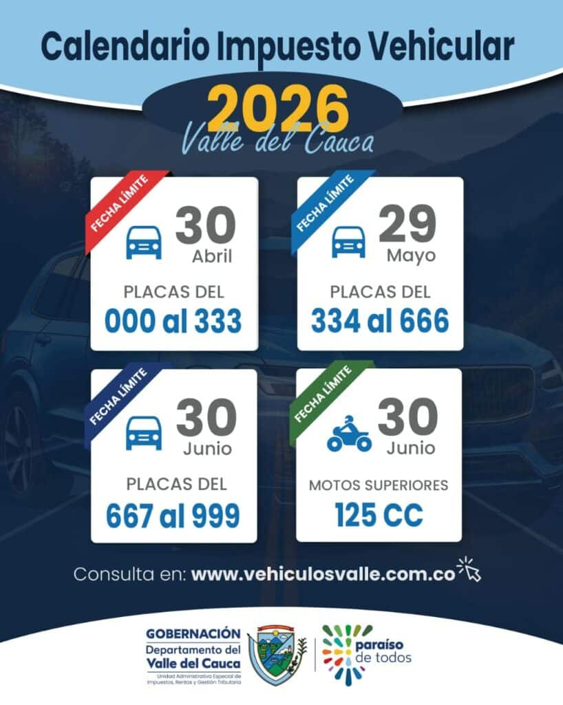 La Gobernación del Valle del Cauca hizo público el cronograma oficial para el pago del impuesto vehicular correspondiente al año 2026. Con el fin de facilitar el cumplimiento de esta obligación y evitar sanciones, el calendario establece fechas escalonadas para los vehículos particulares matriculados en el departamento.