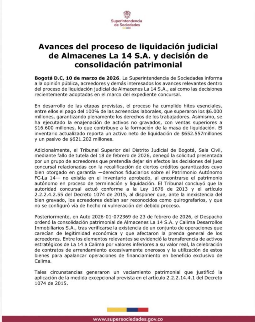 Otra decisión importante dentro del proceso de liquidación fue unir los bienes de Almacenes La 14 S.A. con los de Calima Desarrollos Inmobiliarios S.A.. La Superintendencia de Sociedades explicó que, al revisar las operaciones entre las dos empresas, se encontraron movimientos que redujeron los recursos disponibles para los acreedores.