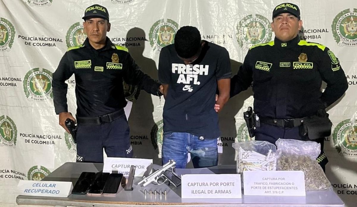 Durante el procedimiento, las autoridades encontraron en su poder un arma de fuego modificada con su respectiva munición, cerca de 800 dosis de estupefacientes y cuatro celulares, entre ellos el dispositivo hurtado, cuyo valor asciende a aproximadamente dos millones de pesos.