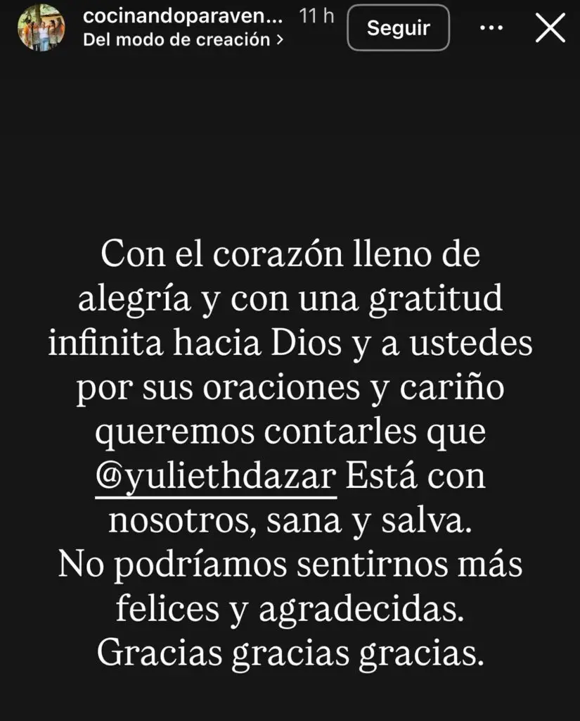 “Con el corazón lleno de alegría y con una gratitud infinita hacia Dios y a ustedes por sus oraciones y cariño queremos contarles que Yulieth está con nosotros, sana y salva. No podríamos sentirnos más felices y agradecidas. Gracias gracias gracias”, señaló la familia por medio de sus redes sociales.